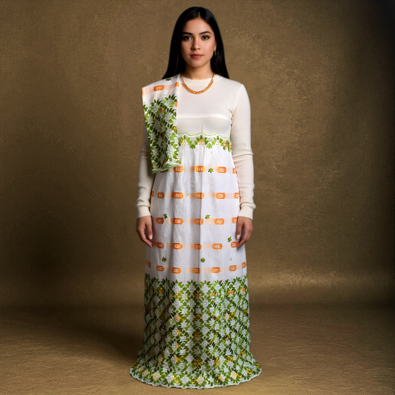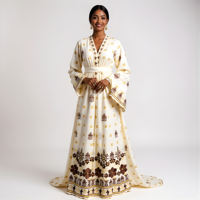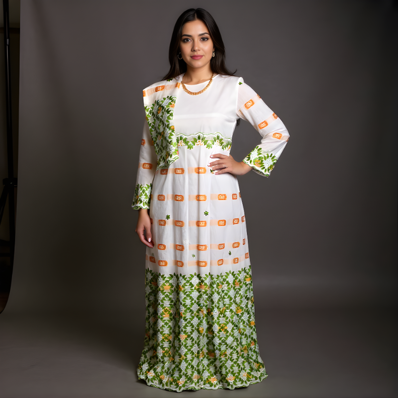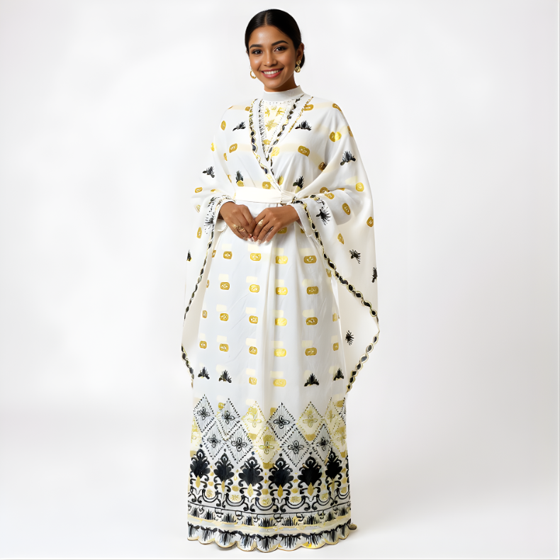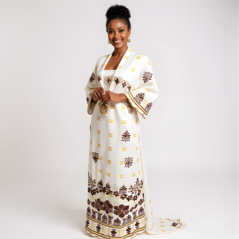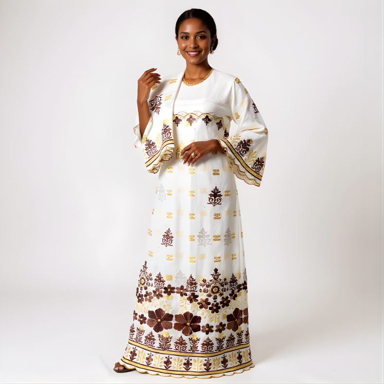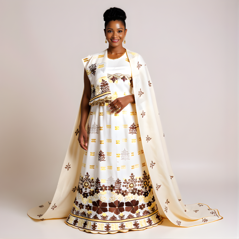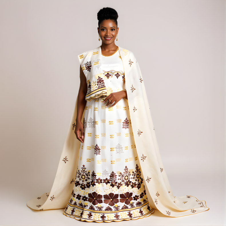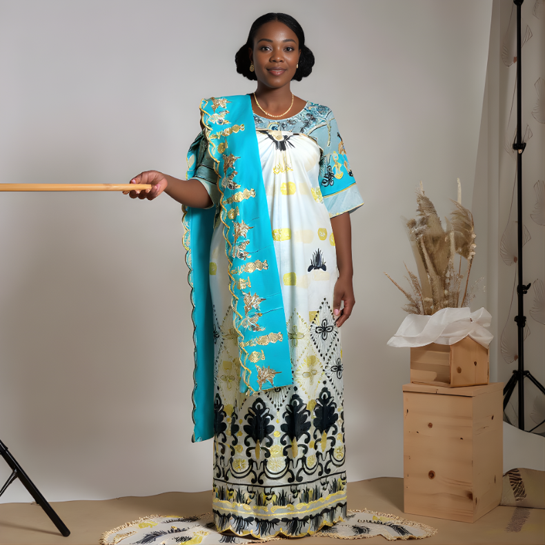 Grâce à son contraste de couleurs et à la richesse de ses broderies, ce modèle est idéal pour les cérémonies, mariages, fêtes culturelles, événements religieux ou toute occasion où l’élégance est essentielle. Cette Salouva met en valeur toutes les silhouettes et attire le regard par son équilibre parfait entre tradition et sophistication.