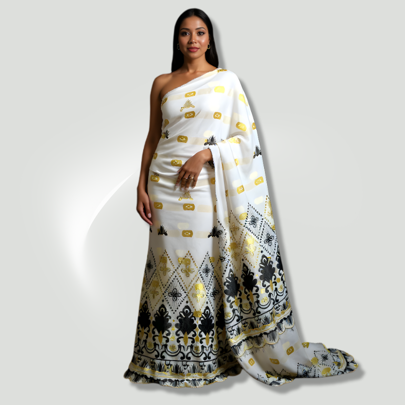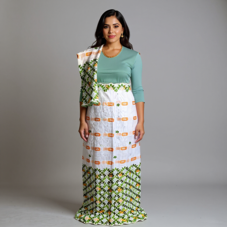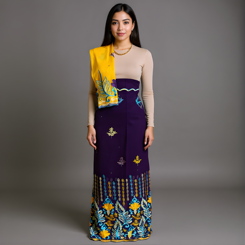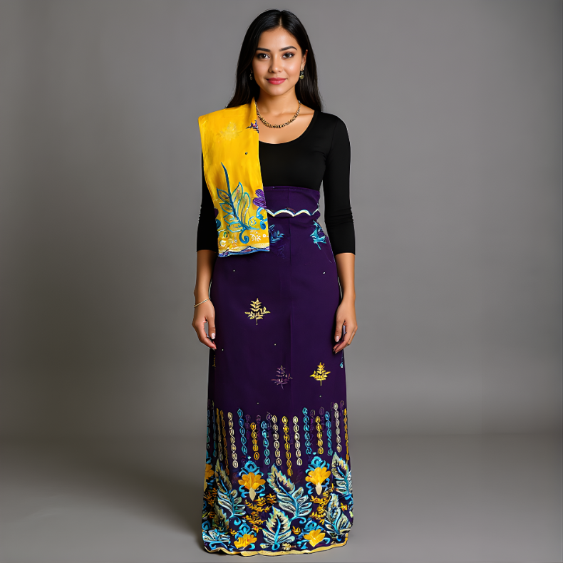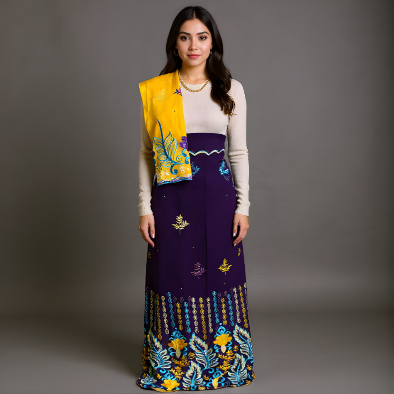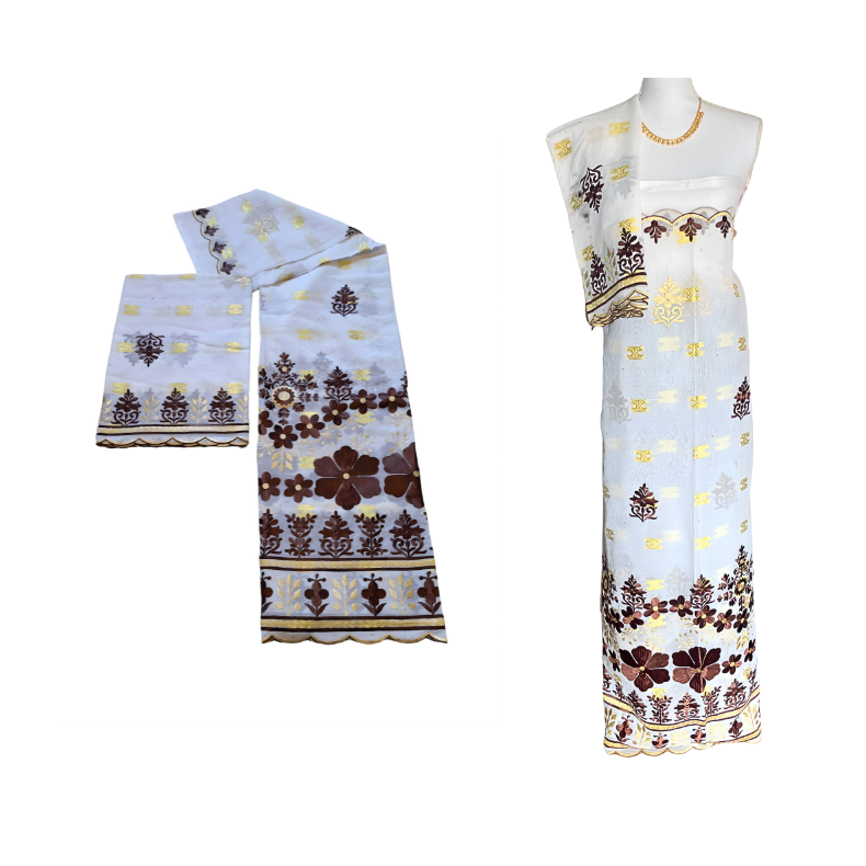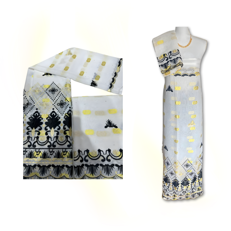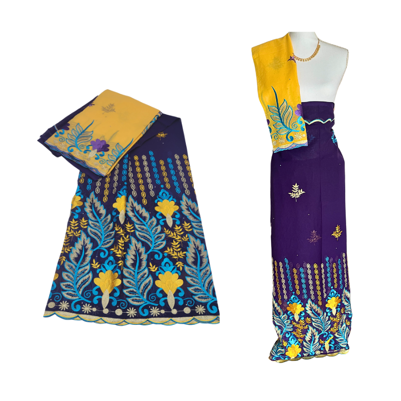 Le bas du tissu est magnifiquement décoré de broderies florales et motifs géométriques, travaillés avec finesse dans des nuances harmonieuses, apportant richesse visuelle et profondeur. Le haut jaune doré, plus lumineux, équilibre parfaitement l’ensemble et met en valeur les broderies grâce à son éclat naturel.