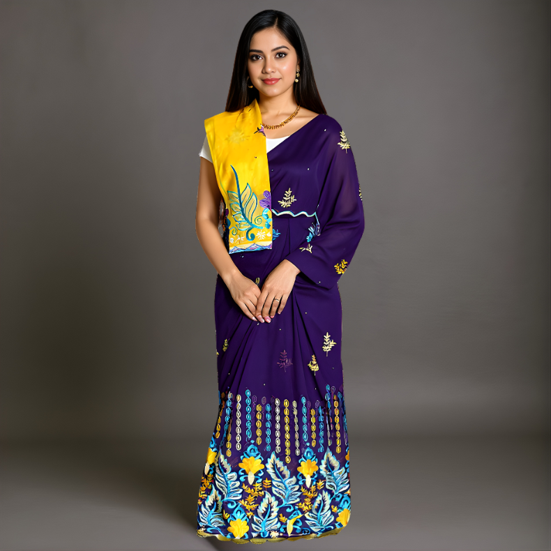 Découvrez la Salouva Brodé Double Face Violet Profond & Jaune Doré, un tissu non cousu d’exception, sublimé par des broderies artistiques et un jeu de couleurs harmonieux entre intensité et éclat.