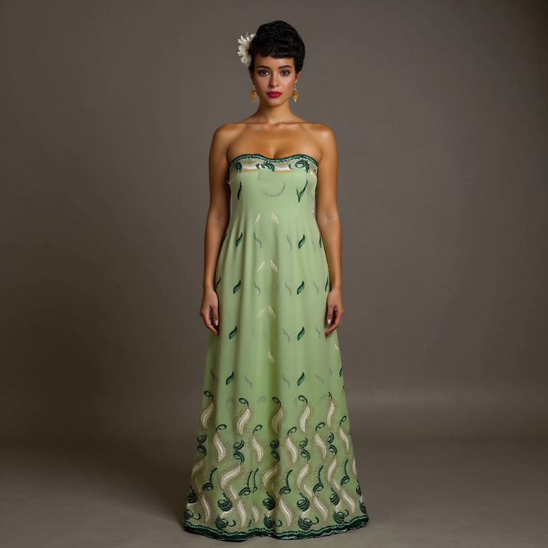 Chaque détail de cette Salouva de luxe est pensé pour sublimer la silhouette féminine : un tombé fluide, un éclat subtil grâce aux cristaux Swarovski, et un design qui célèbre la femme africaine dans toute sa grâce.
