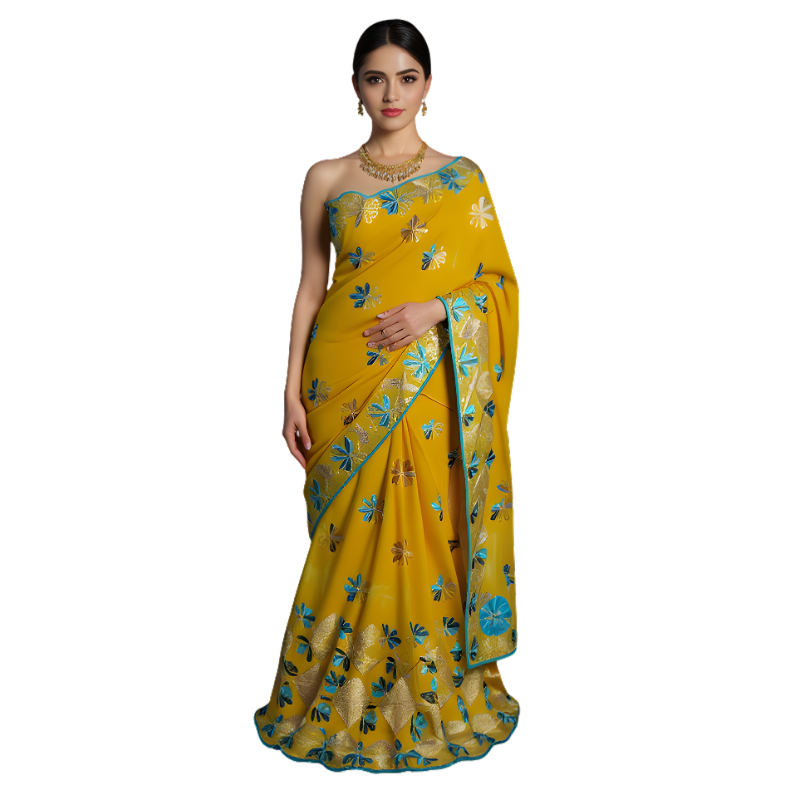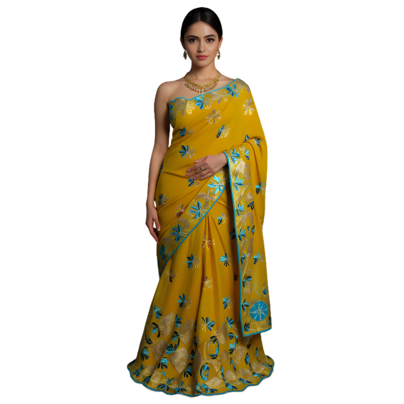 Broderie : Motifs travaillés en nuances de vert et argent, rehaussés de Swarovski scintillants.