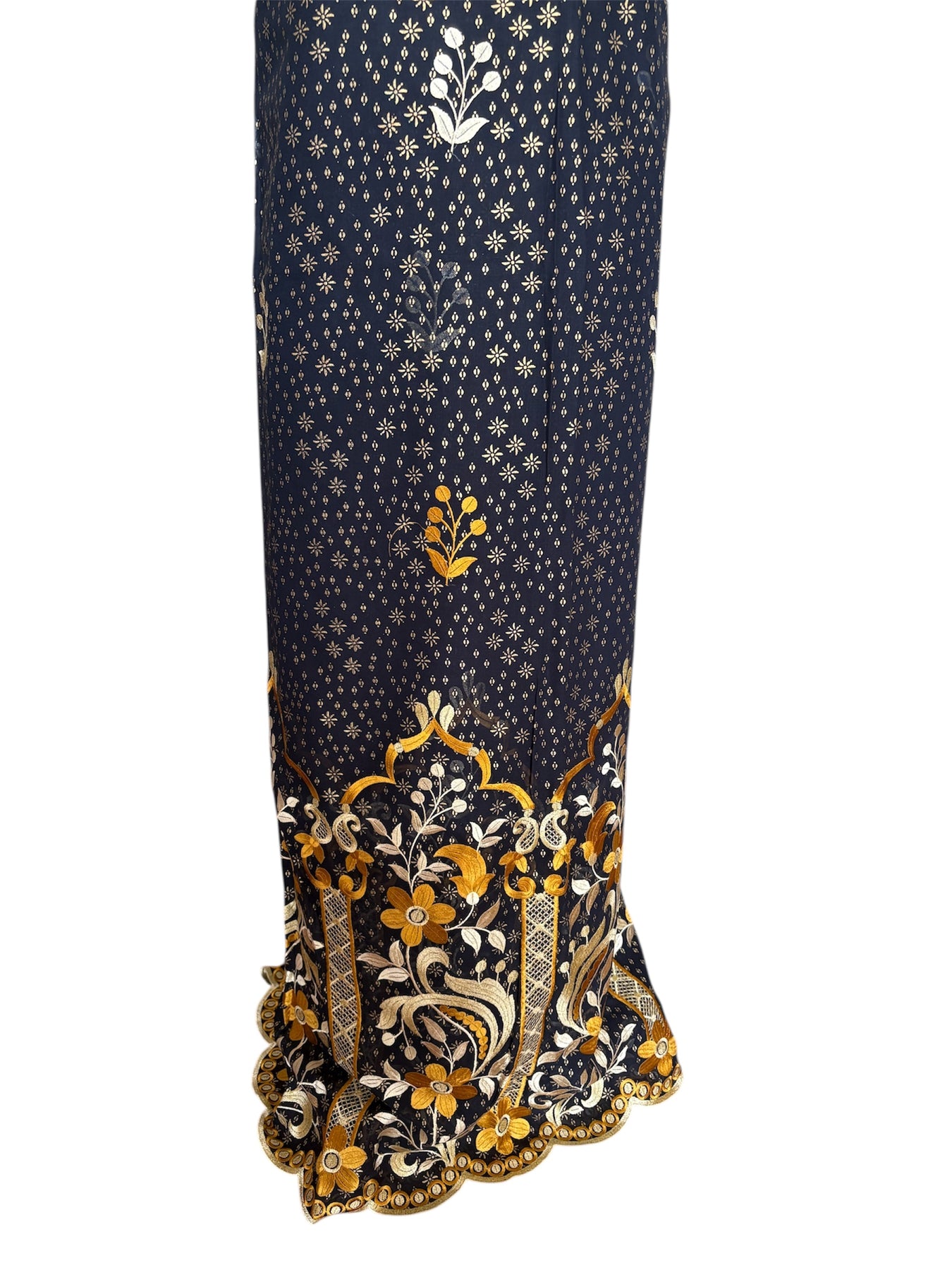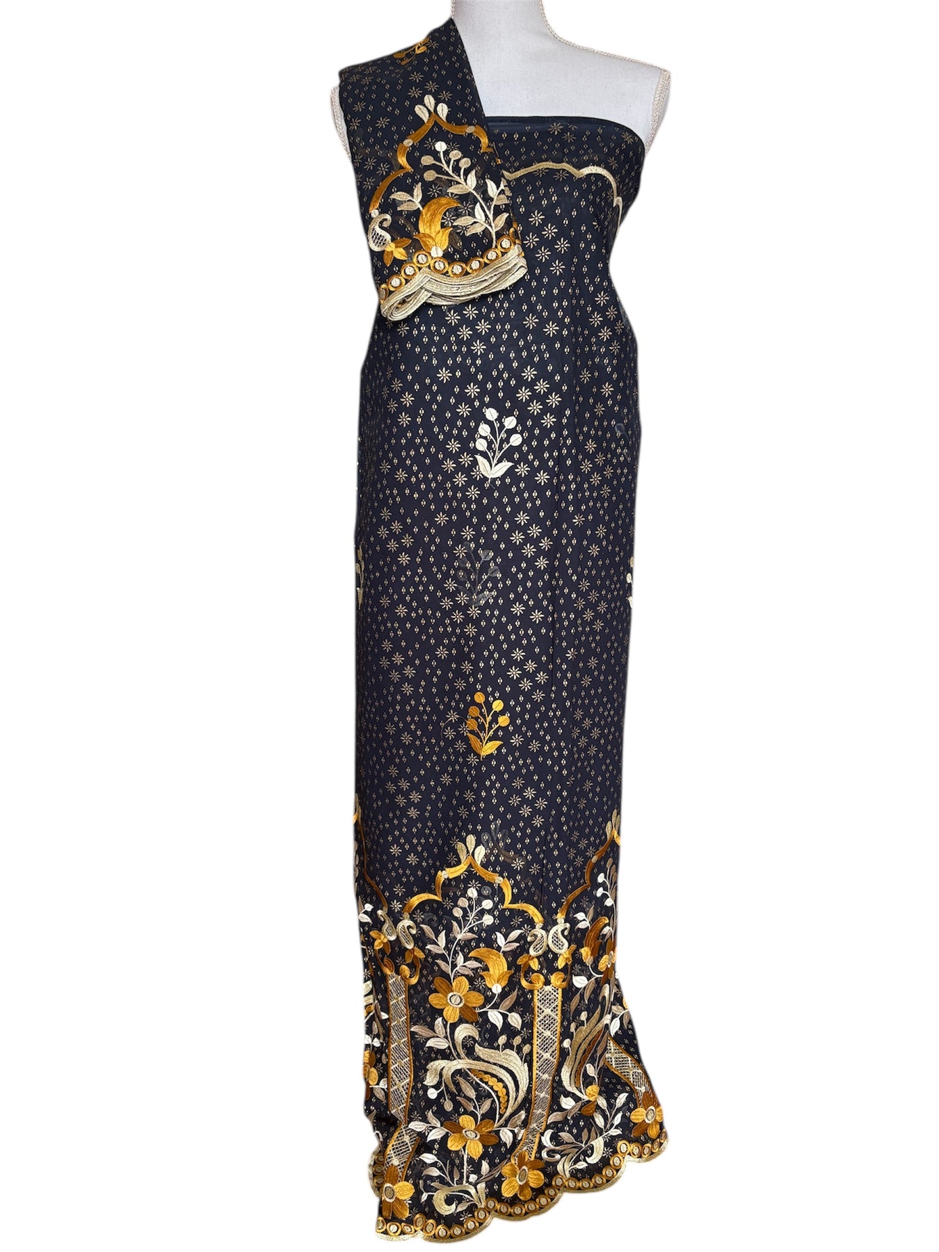 Les broderies raffinées, jouant sur des nuances de vert foncé et argenté, sont sublimées par des cristaux Swarovski qui apportent éclat et modernité à ce tissu traditionnel.